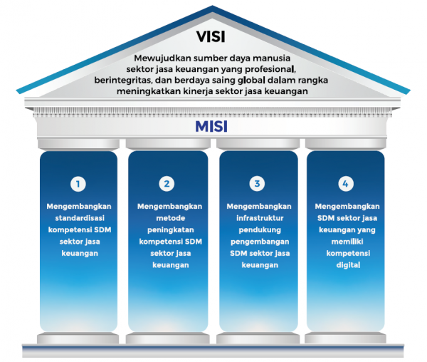 Selanjutnya visi tersebut didukung dengan 4 (empat) Misi yaitu (i). Mengembangkan standarisasi kompetensi sumber daya manusia sektor jasa keuangan; (ii). Mengembangkan metode peningkatan kompetensi sumber daya manusia sektor jasa keuangan; (iii). Mengembangkan infrastruktur pendukung sumber daya manusia sektor jasa keuangan; dan (iv) Mengembangkan sumber daya manusia sektor jasa keuangan yang memiliki kompetensi digital.