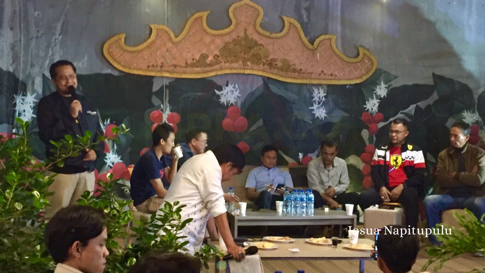 Dosen FISIP Universitas Lampung, Darmawan Purba SIP MIP (kiri), dalam acara diskusi publik di Kafe Cikwo, Bandar Lampung, pada Minggu (26/6) malam. Foto: Josua Napitupulu
