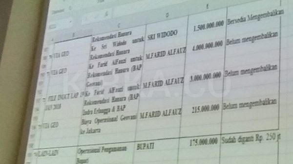 Dalam catatan yang diperlihatkan di hadapan Majelis Hakim kali ini, Indra Erlangga mencatat tiga penyerahan uang yang tertuliskan nama M.Farid Alfauzi dalam kolom dengan keterangan pihak yang menikmati, dengan tertulis pula bahwa uang tersebut belum dikembalikan.
