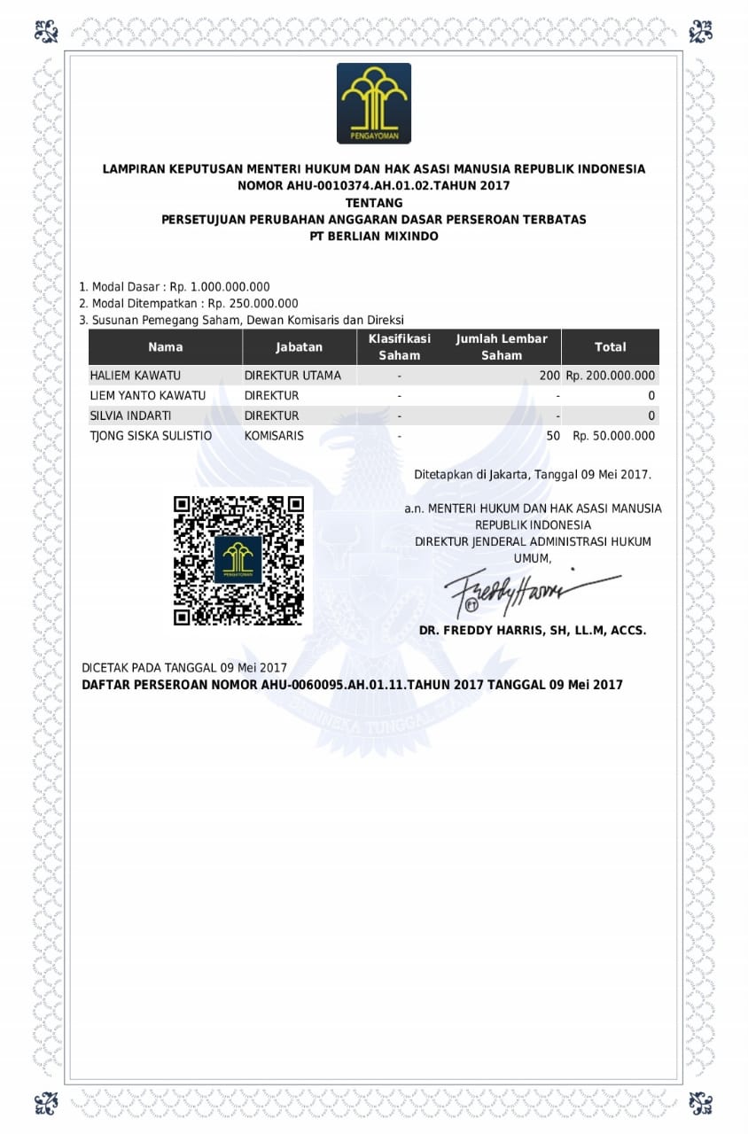 Dalam dokumen Kementerian Hukum dan HAM disebutkan bahwa Komisaris PT Berlian Mixindo adalah Tjong Siska Sulistio, bukan Yusril Ihza Mahendra. “Saya sendiri kaget membaca berita ini. Karena itu saya segera menelusuri dokumen perusahaan-perusahaan, dan ternyata seperti dugaan saya sebelumnya, nama saya tidak ada kaitannya dengan PT Berlian Mixindo”.