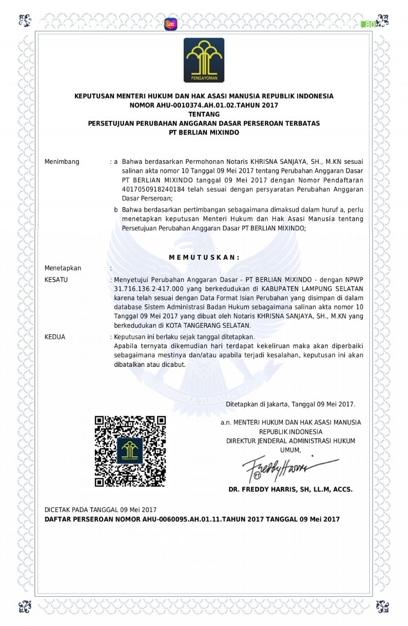 170509 – Akta PKPS di Luar RUPS No. 10 PT Berlian Mixindo