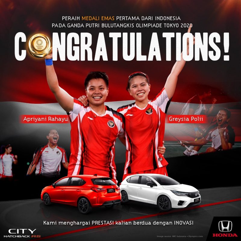 Kami turut bangga atas pencapaian Greysia dan Apriyani dalam mewujudkan impian dan mengharumkan nama bangsa di kancah dunia.#Honda #Hondaisme #GreysiaApriyani pic.twitter.com/51F0hWR1Mm— Honda Indonesia (@hondaisme) August 6, 2021
