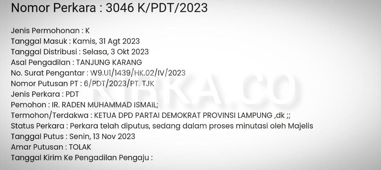 KIRKA – Kasasi gugatan Raden Ismail ke Ketua DPD Partai Demokrat Lampung ditolak oleh Majelis Hakim Mahkamah Agung Republik Indonesia.