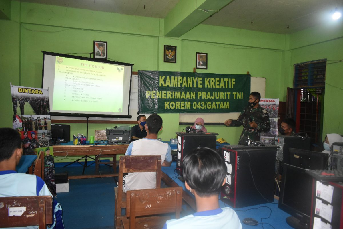 KIRKA – Guna menumbuhkan minat dan motivasi generasi muda khususnya dikalangan pelajar di wilayah Bandar Lampung, Korem 043 Garuda Hitam menggelar kampanye kreatif Sosialisasi Rekrutmen Penerimaan Prajurit TNI AD.