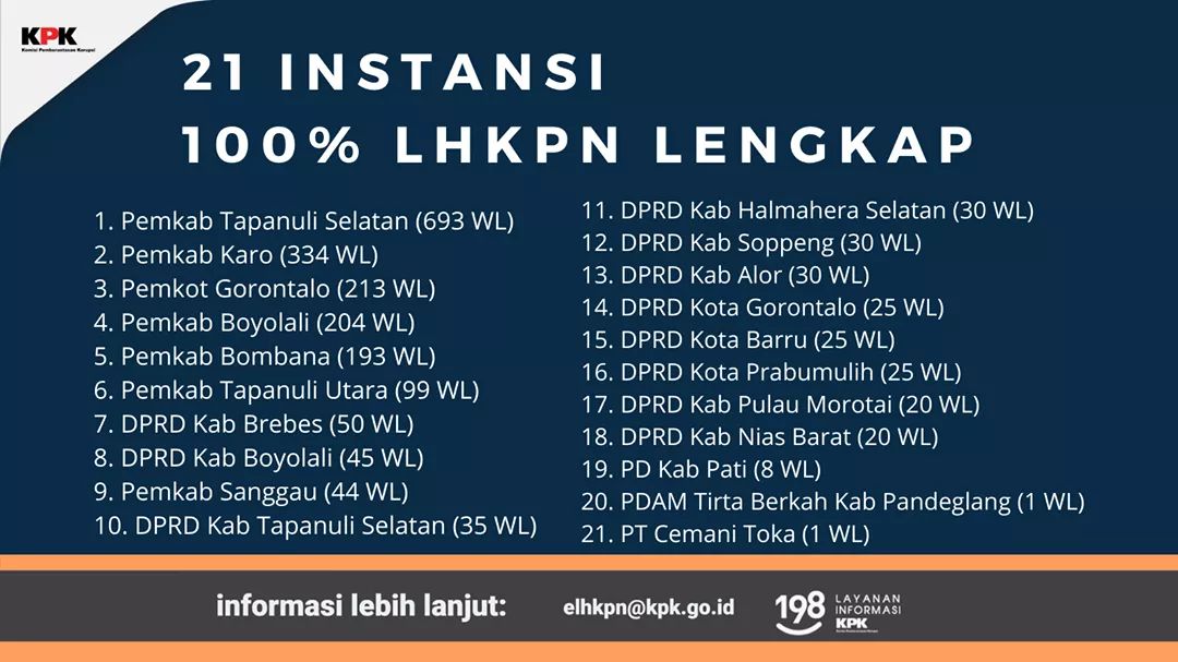KIRKA – Rabu (24/02), melalui Official Facebook milik Komisi Pemberantasan Korupsi Republik Indonesia (KPK RI) mengabarkan kepada publik 21 instansi yang telah memenuhi 100 persen kepatuhan Laporan Harta Kekayaan Penyelenggara Negara (LHKPN) dengan status kelengkapan dianggap lengkap.