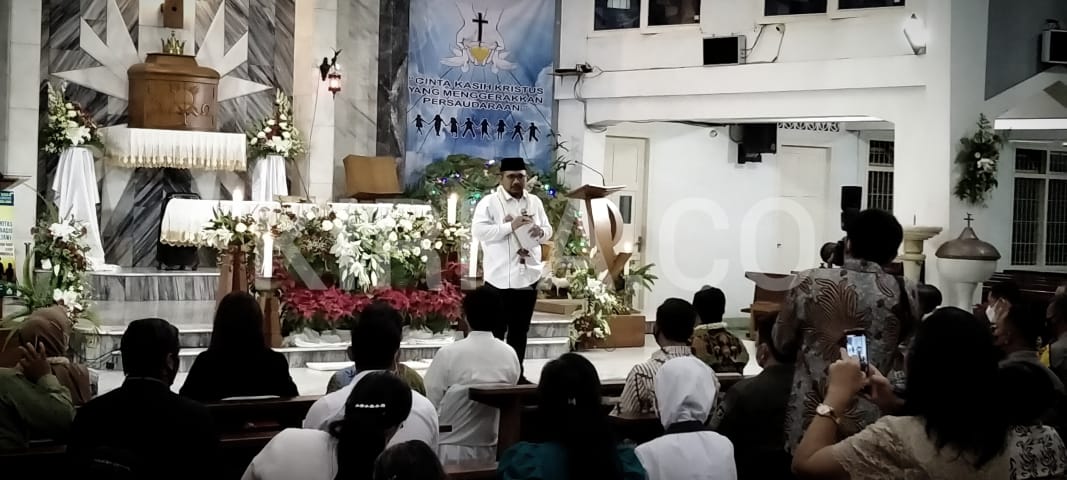 KIRKA – Pada gelaran Misa Natal di Bandar Lampung, Gus Yaqut sampaikan ungkapan Sayyidina Ali di hadapan jemaat Katolik Gereja Katedral Kristus Raja, Jumat malam 24 Desember 2021.