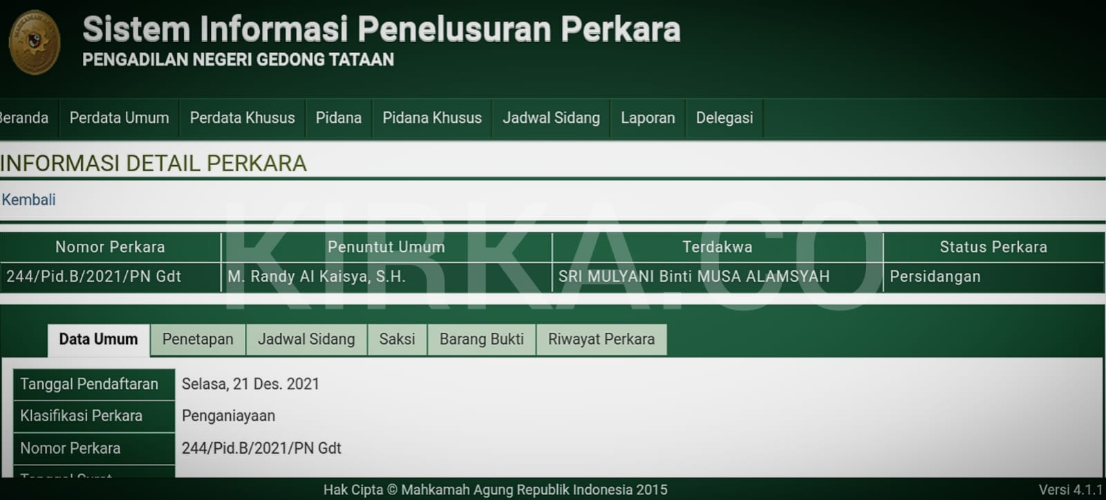 Sri Mulyani, harus didudukkan sebagai seorang Terdakwa perkara penganiayaan, dan disidangkan di Pengadilan Negeri Gedongtataan, yang persidangannya sendiri telah berlangsung sejak 28 Desember 2021 kemarin.
