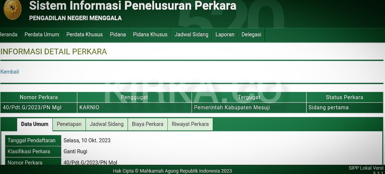 Tangkapan layar SIPP PN Menggala, terkait gugatan ganti rugi terhadap Pemkab Mesuji. Foto: Eka Putra