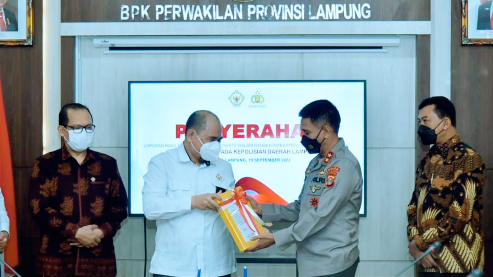 KIRKA – Polda Lampung terima Perhitungan Kerugian Negara kasus Jalan Sutami dari BPK RI pada 19 September 2022 di Kantor BPK Perwakilan Lampung.
