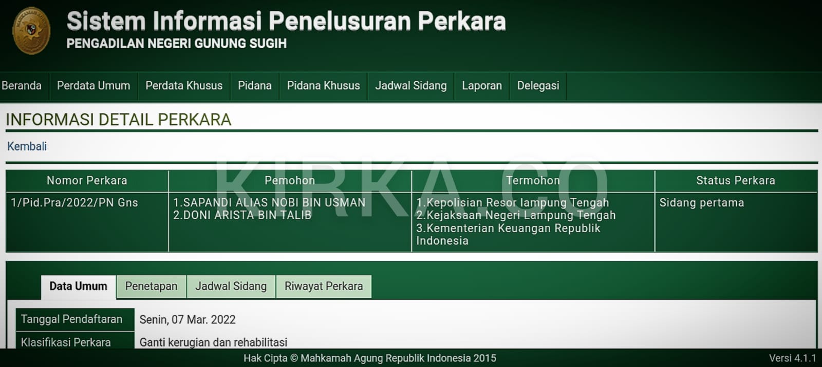 Permohonan tersebut dilayangkan oleh Sapandi dan Doni Arista, yang resmi didaftarkan ke meja PTSP PN Gunungsugih pada Senin 7 Maret 2022 kemarin, dan terdaftar dengan Nomor Perkara 1/Pid.Pra/2022/PN Gns.