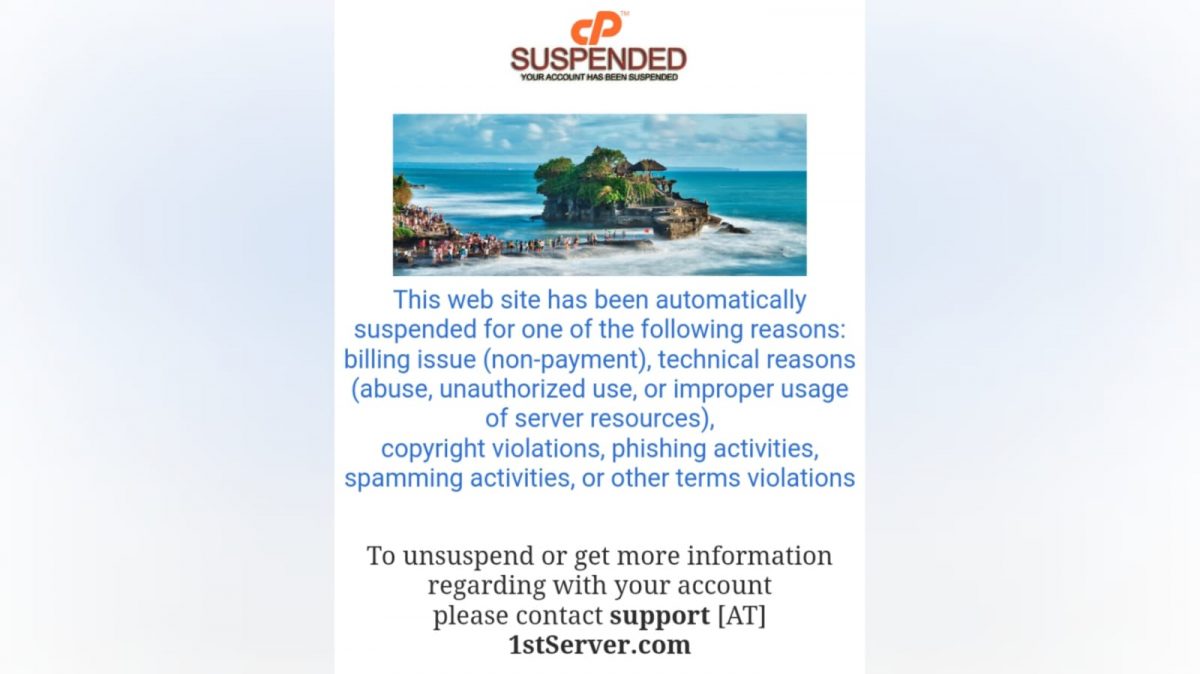 “This web site has been automatically suspended for one of the following reasons: billing issue (non-payment), technical reasons (abuse, unauthorized use, or improper usage of server resources), copyright violations, phishing activities, spamming activities, or other terms violations”.