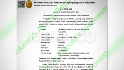 KIRKA – Aditya Karjanto divonis oleh Hakim PT Tanjungkarang membayar sejumlah Kerugian Negara dua kali lebih besar dari putusan yang dijatuhkan oleh Majelis Hakim PN Tanjungkarang, yakni sebesar Rp686 juta lebih. Putusan tersebut dibacakan oleh Majelis…